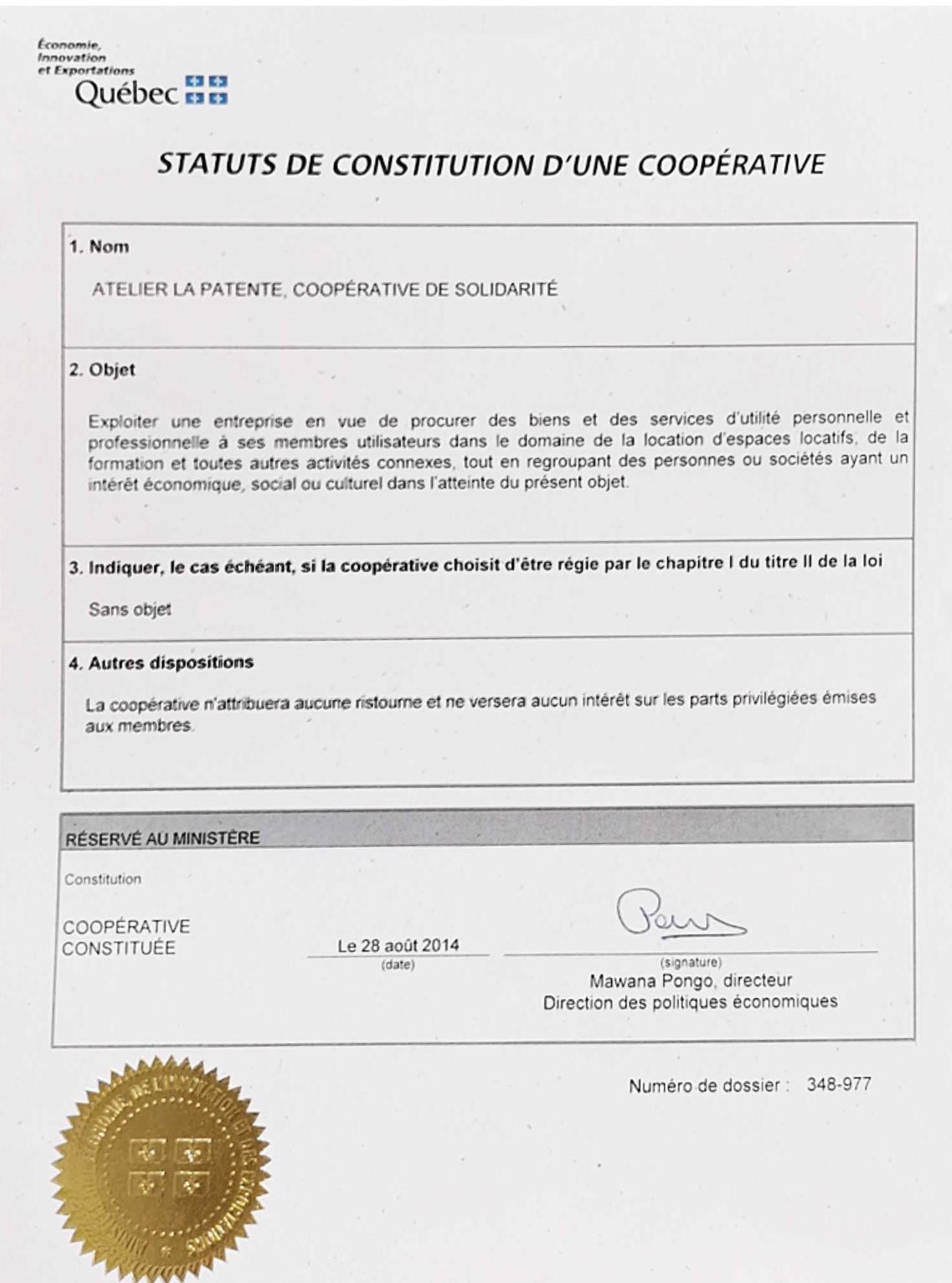 L’Atelier La Patente, coopérative de solidarité a été constitué le 28 août 2014! C’est le 15 Septembre 2014 au Centre Monseigneur Lacroix, lors de son assemblée générale d’organisation, que notre coopérative a été officiellement fondé . Près de 60 membres fondateurs se sont déplacés pour établir les bases de notre organisation et élire notre premier conseil d’administration qui sera constitué de Pénélope Roberge, Claude Paradis, Gilbert Garcia, Joé Blais, David Viens, Dominic Dumontet Patrick Pelletier. Cette […]
